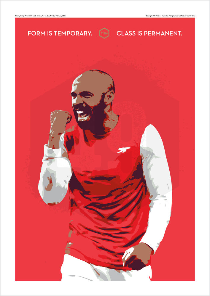 Immortalizing Thierry Henry’s magical Second Coming, when he scored for Arsenal against Leeds in a crucial FA Cup tie, the print is a perfect example of a “defining moment’. It was a fairy-tale, triumphant return to the club by one of Arsenal’s most beloved legends.