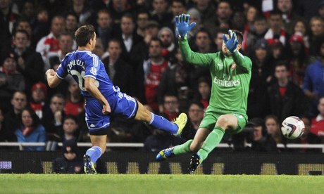The visitors went 1-0 up in the 25th minute as they countered quickly off an Arsenal corner. They broke and the ball was challenged for just inside the Arsenal half and went airborne, landing just outside the penalty area. Wilshere gestured to Jenkinson that he had time, seemed to change his mind, and the right back was forced into a late header back towards goal, but it wasn’t quite strong enough and Cesar Azpilicueta pounced on it to beat Fabianksi. Poor defending and poor communication, but Chelsea was deservedly in front.