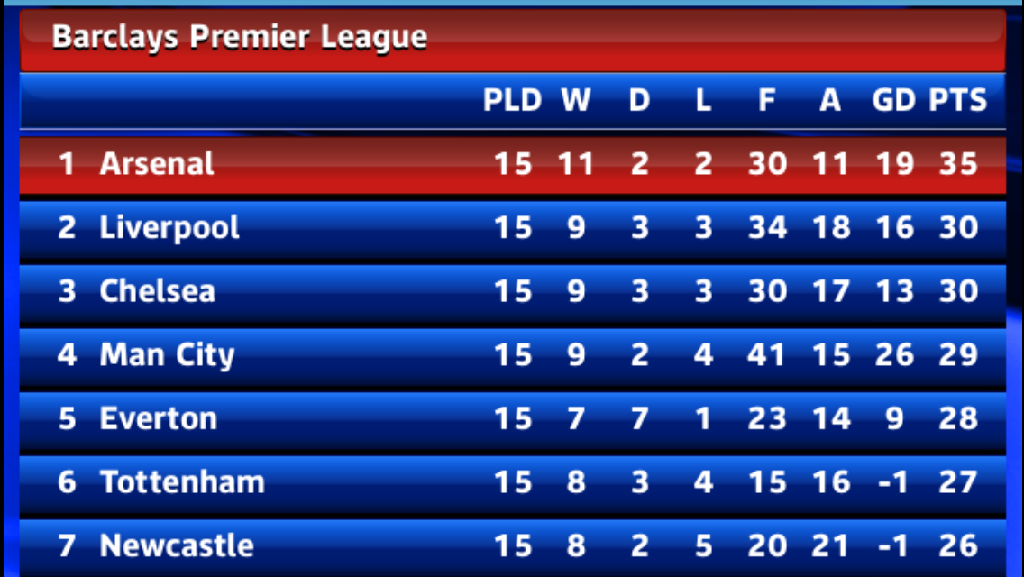 Give me strength! If someone had told me at the beginning of the season that by Xmas (or nearly Xmas) we would be sitting top of the league with 5 clear points, I would have taken that result straight away and signed Wenger up for another 4 years. Yet there are some muppets who still declare ”Wenger out!” Tools.