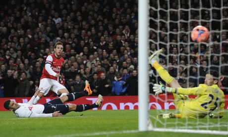 The onus on the second period was for Arsenal to come out and exert our dominance to extend our lead and although we enforced plenty of early pressure, Soldado blasted one over the bar and put another one wide inside the opening ten minutes. Emmanuel Adebayor then missed the visitors best chance of the half as he controlled a cross well inside our area, but amusingly fell over whilst attempting to shoot on the turn. It summed up his game quite nicely as it was another Emirates return to forget for the ex-Gunner turned Mercenary.