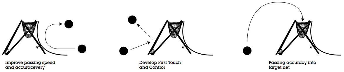 Featuring a trampoline side that – like a standard rebound net – fires the ball back from a lofted pass, the Football Flick demands a far greater range of skills than the average training aid. The ramped side of the product requires players to take the ball down and play a pass along the floor – one of the most crucial skills in the modern world of slick possession football – while the netted section in the middle allows for chipping games and challenges.