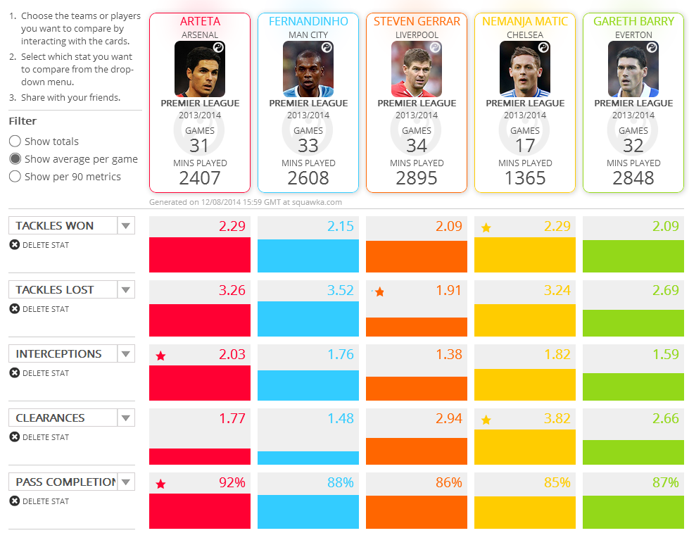 He’s on par with or better than any other defensive midfielder in last season’s top five teams in terms of tackles won and interceptions bar Nemanja Matic (the Chelsea midfielder played less game, though) and has the best pass completion percentage of the crop, which tells me Mikel Arteta didn’t perform that bad.