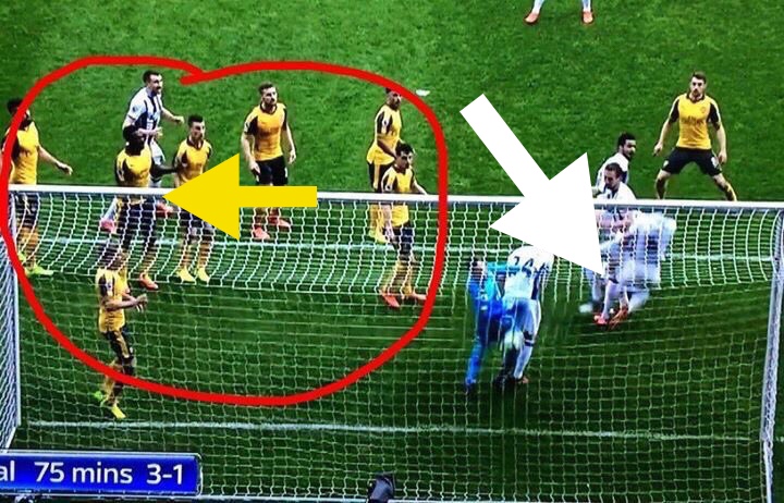 Kos moves to the front post, the rest of the defence follow like lemmings, the attackers amble to the back post unchallenged and score.