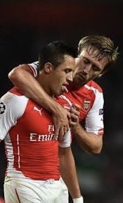 Alexis picks the ball up on the left, cuts inside, Alexis then plays the ball between the right back and centre back, Monreal overlaps, picks up the ball and plays a low ball across the 6 yard box.