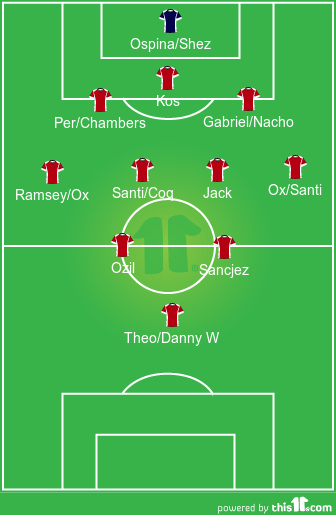However, given that this is a hugely attacking formation I would leave Le Coq out in my first choice for openers and go with Ox, Jack, Santi and Ramsey, but would but would be happy with Coq of course. It is a slight risk having Ox on the left but hey Bobby Pires rarely used his left foot and Jack and Santi would be so assured and comfortable receiving the ball from the defence and Ramsey and Alex have such good stamina.
